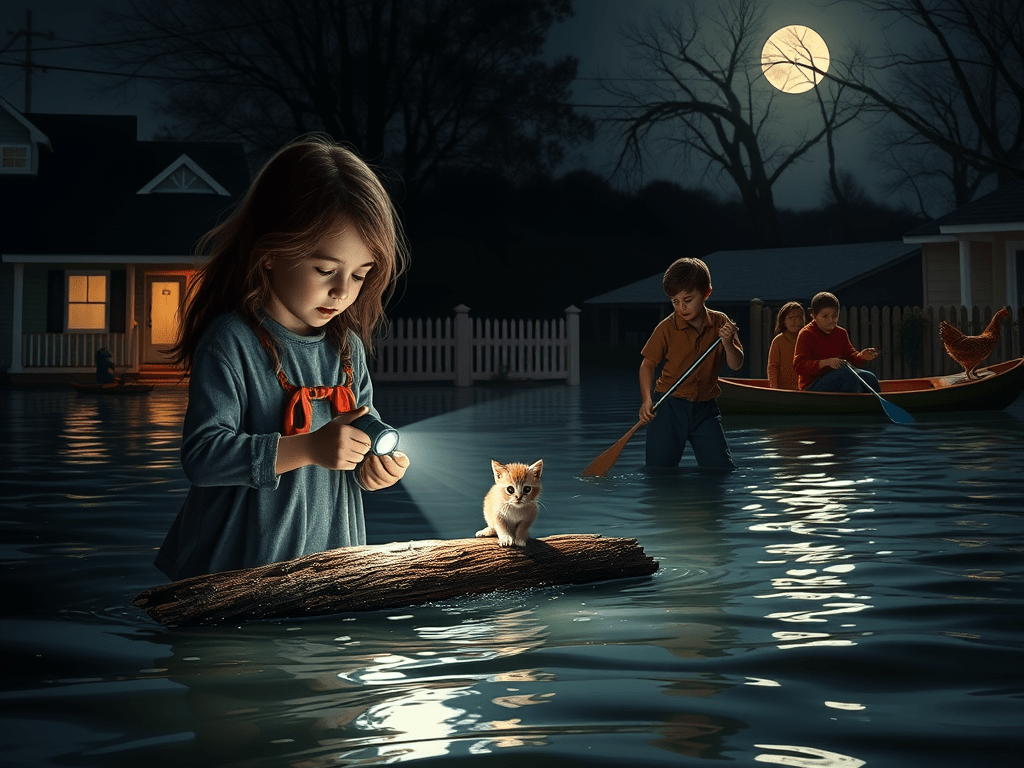 Olivia and Ethan were the first to make a rescue—a tiny kitten stranded on a piece of driftwood. Ethan waded carefully into the water while Olivia held the flashlight steady.
