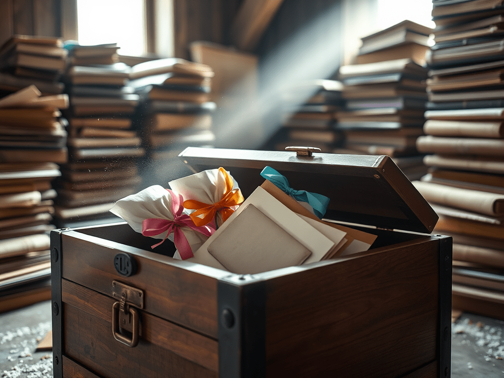 Lily carefully opened the chest, the creak of the hinges adding to the mystery. Inside were bundles of letters, tied with ribbons of varying colors—some pink, some blue, and some golden yellow. The air seemed to hum with the stories tucked inside each envelope.